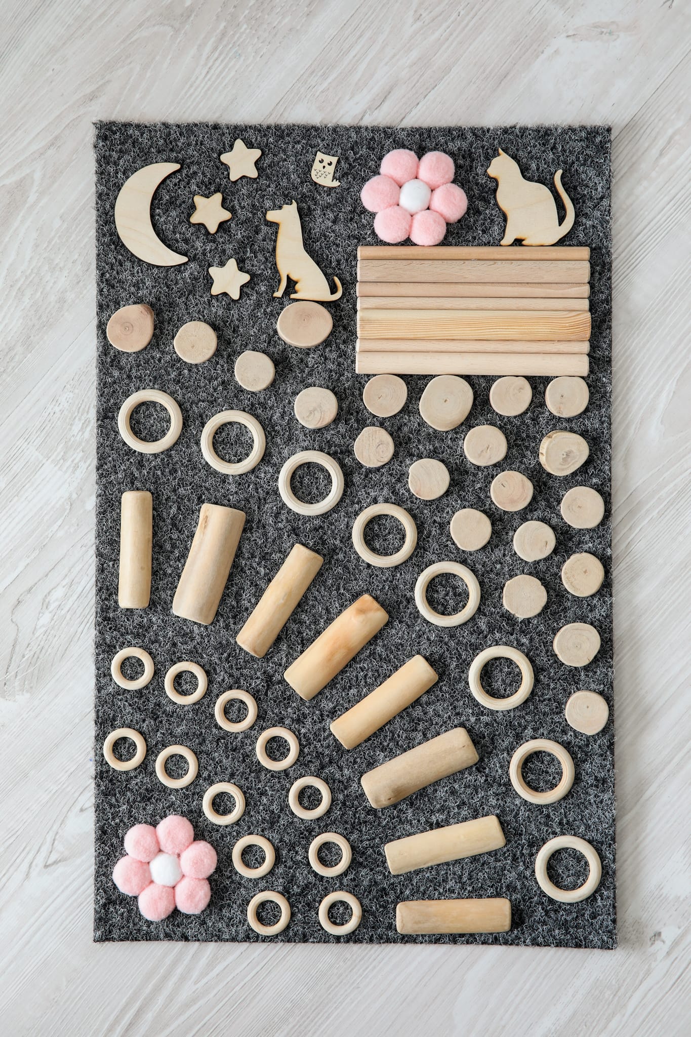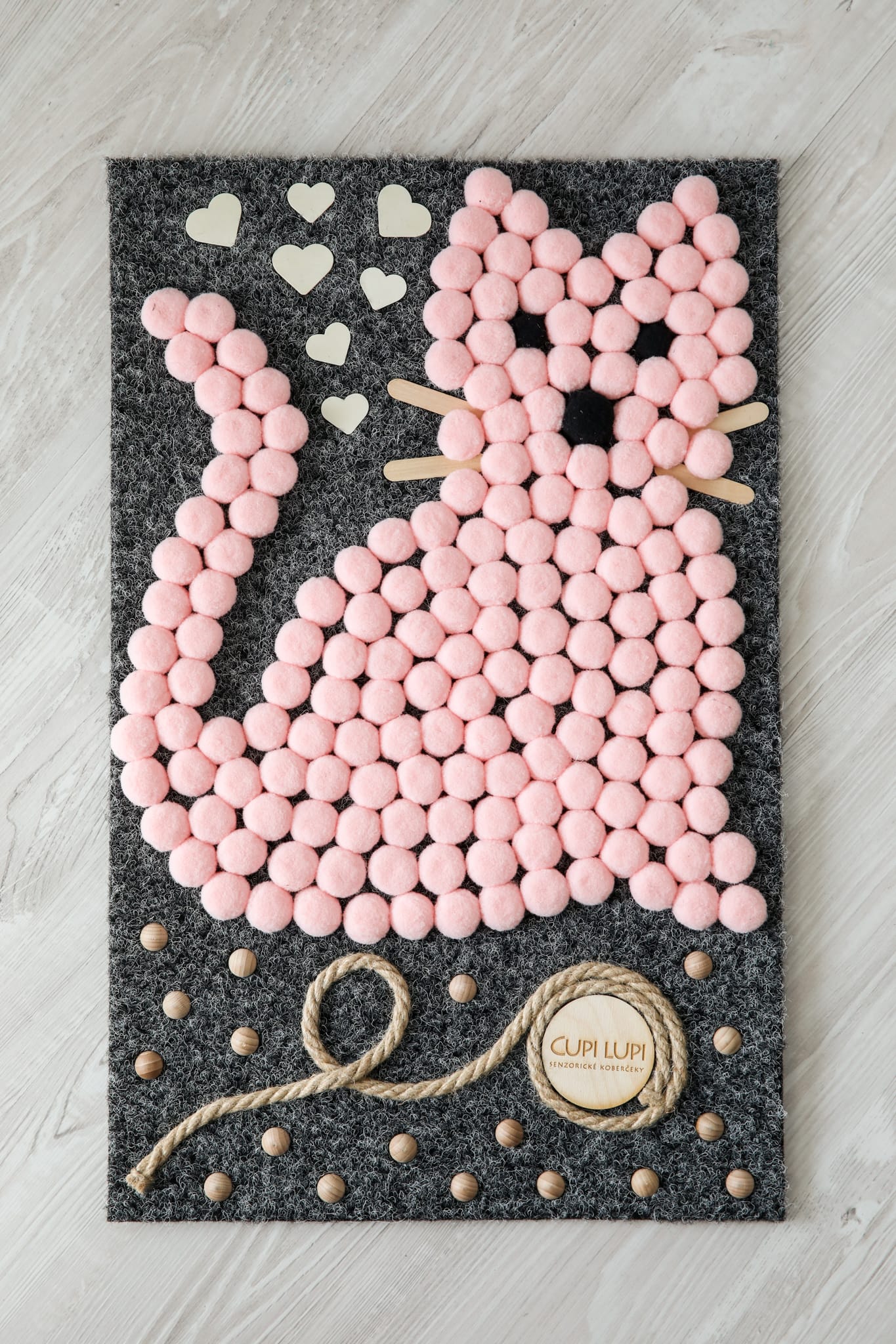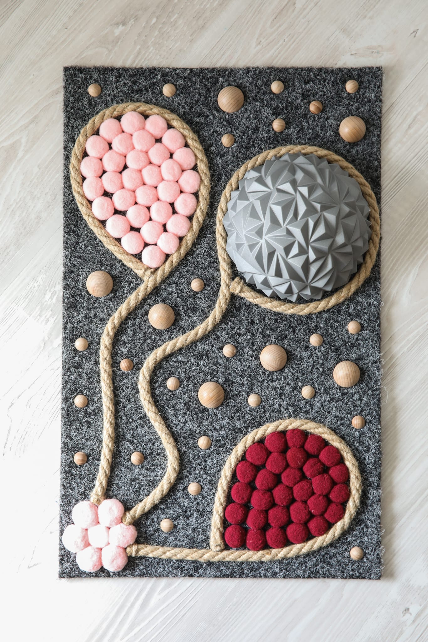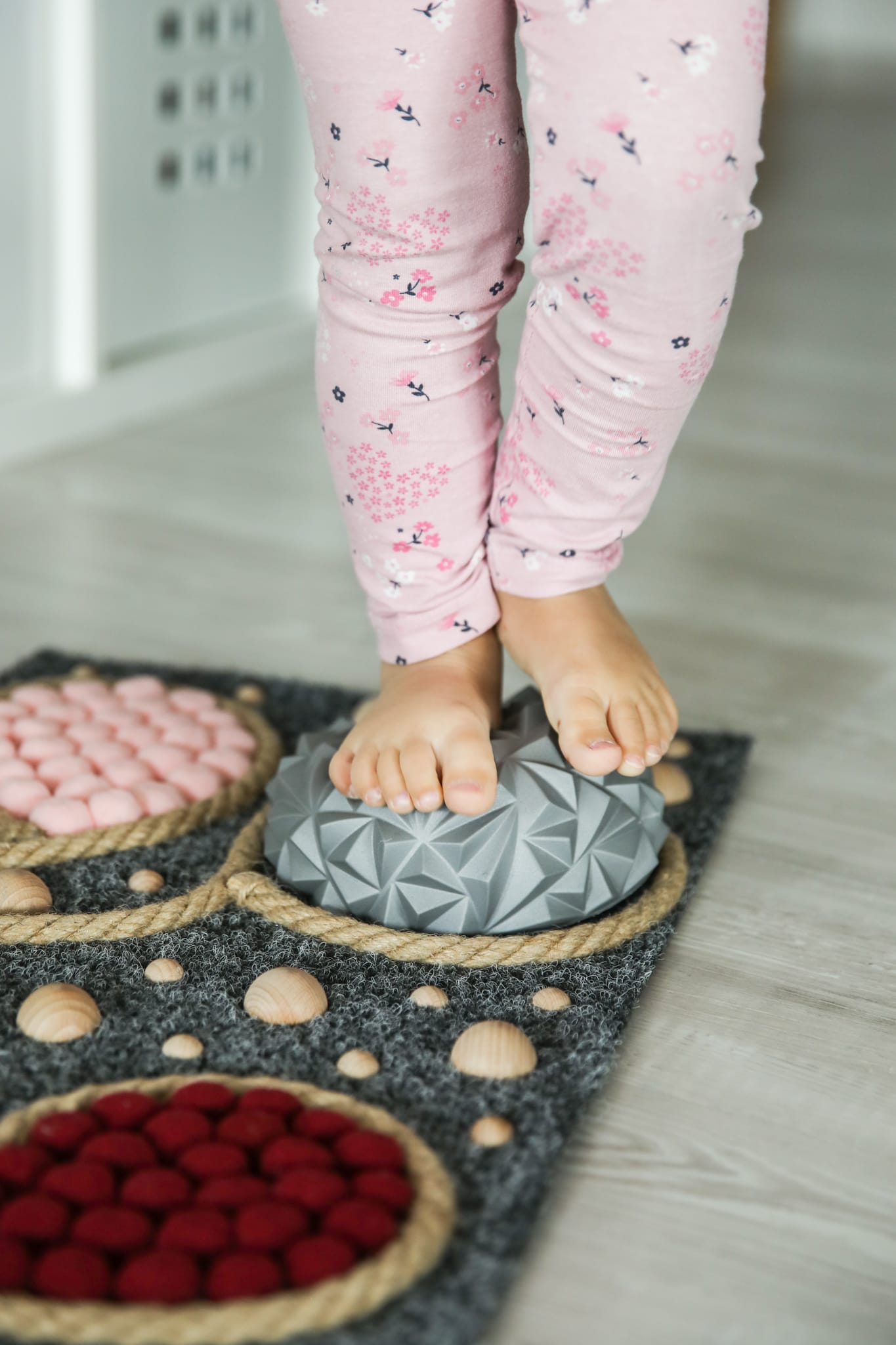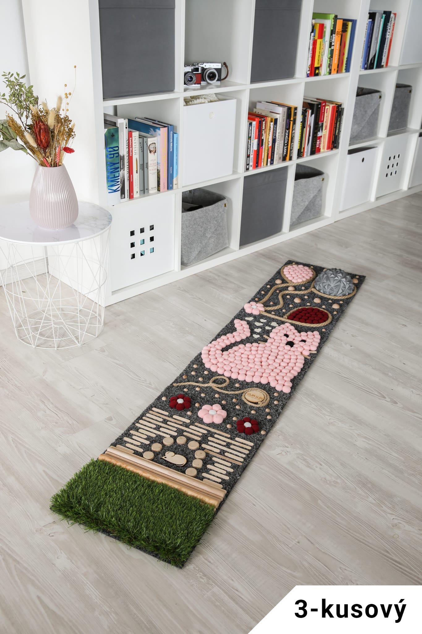 Ručne vyrábaný senzomotorický koberček je doplnený drevenými prvkami, farebnosť a hravosť mu dodávajú zvieratká, kvetinky farebné balóniky a balančné prvky rôznych farieb i povrchov. Detský koberc je prevažne rúžový a preto je to koberec skôr pre dievča alebo bábätko.